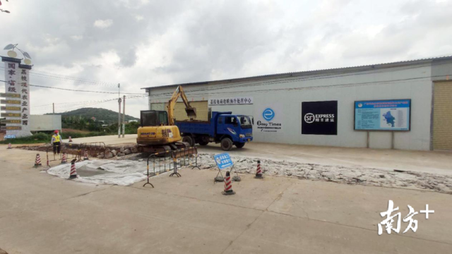 高州市根子鎮(zhèn)易時(shí)代荔枝電商產(chǎn)品處理中心前工人們正對(duì)路面進(jìn)行修整
