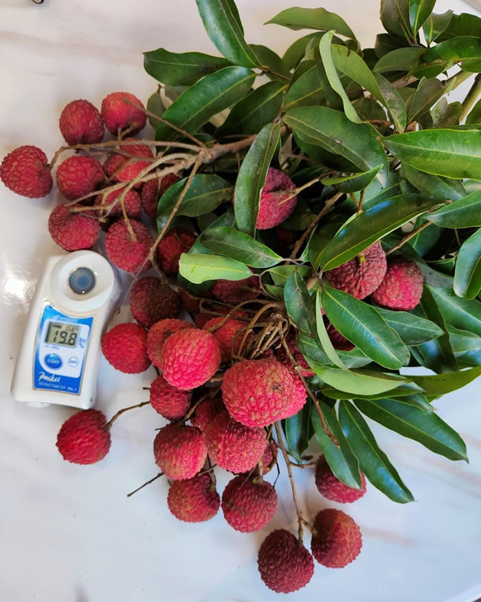 專家組在福建省漳州市云霄縣東廈鎮(zhèn)東崎村清堯家庭農(nóng)場進行現(xiàn)場測產(chǎn)與品質(zhì)鑒定,認(rèn)真聽取了選育團隊對‘鳳山紅燈籠’荔枝新品種選育情況的匯報,就有關(guān)問題進行了質(zhì)詢與討論,經(jīng)現(xiàn)場測產(chǎn),2003年高接的18年生樹平均株產(chǎn)108.4kg、折合畝產(chǎn)1518.1kg、平均單果重22.2g、 焦核率82.0%、可溶性固形物19.1%、可食率84.3%;果實肉質(zhì)細嫩、清甜多汁,品質(zhì)優(yōu)。一致同意該品種通過現(xiàn)場鑒評。