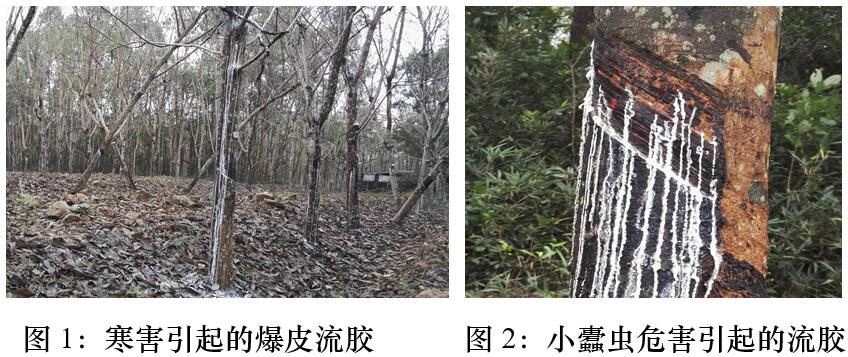 橡膠樹遭遇長期低溫后,葉、枝及樹干均會造成不同程度的損傷,葉片受害初期褪綠變黃,枝條受害干枯,莖干受害后皮層變褐壞死甚至爆皮流膠,嚴(yán)重受害會導(dǎo)致膠樹整株枯死。專家建議生產(chǎn)單位于低溫寒潮后盡快組織人力進(jìn)行膠園寒害情況檢查,及時發(fā)現(xiàn)、處理寒害造成的膠樹枯枝、枯樹和傷樹。其方法主要為:截除橡膠園內(nèi)的枯枝、枯樹,并移到園外集中處理;截后留下的樹樁、樹枝和受傷樹皮可選用敵敵畏乳油、高效氯氟氰菊酯乳油、吡蟲啉可濕性粉劑等藥劑,按推薦濃度噴施預(yù)防蟲害。