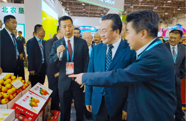 農(nóng)業(yè)農(nóng)村部黨組成員、副部長鄧小剛(前排中),農(nóng)業(yè)農(nóng)村部農(nóng)墾局一級巡視員程景民(前排左),廣東省農(nóng)墾集團公司(農(nóng)墾總局)黨委委員、副總經(jīng)理(副局長)莫仕文(前排右)到廣東農(nóng)墾展位調(diào)研指導