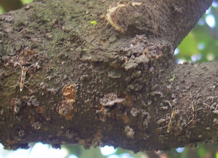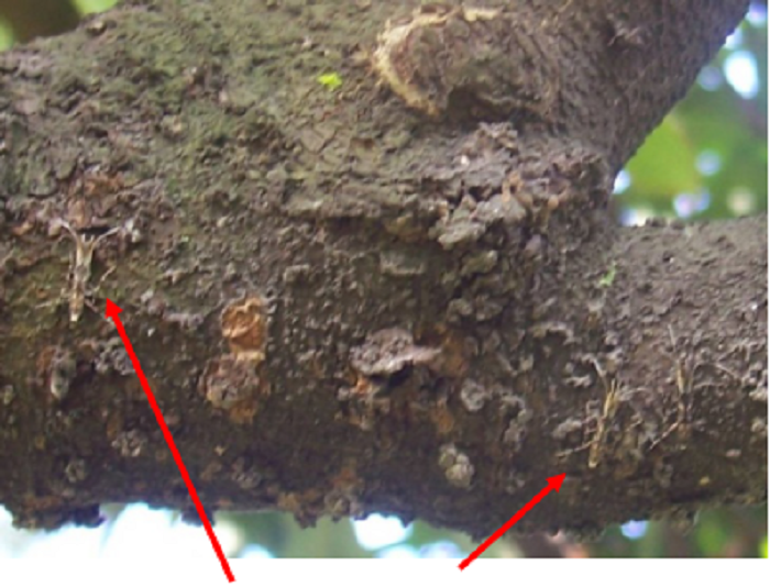 三、檢查藥效,及時進行補藥噴殺。根據成蟲白天棲于陰涼的樹冠內膛枝桿上(如下右圖),受到驚嚇時會飛離枝桿這一特性,可每天清晨到果園進行實地調查,對荔枝內膛的枝桿進行拍打(如下左圖),如發(fā)現還有成蟲飛出,2天后再次噴藥。