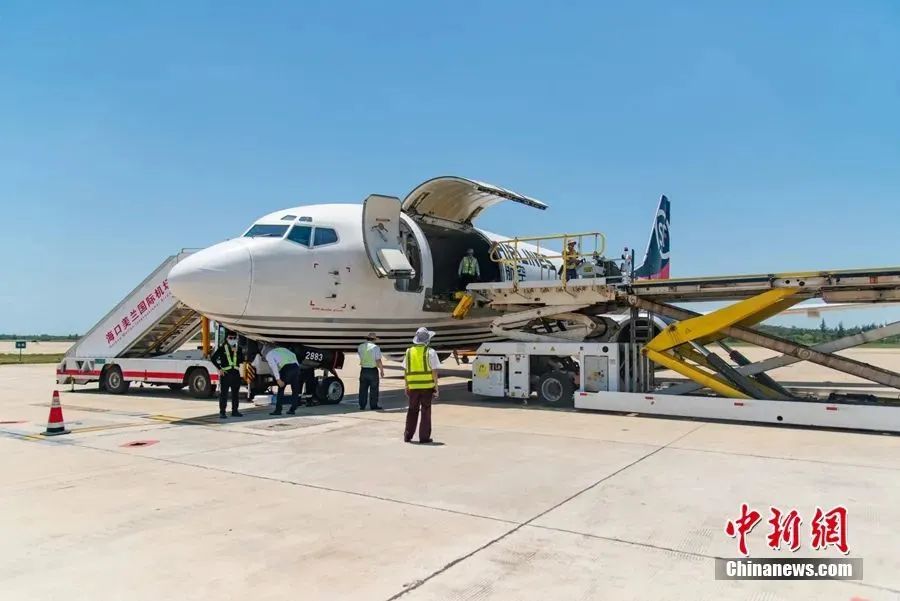 圖為??谥辽钲谕诞a(chǎn)地直發(fā)的荔枝貨機(jī)專線。??诿捞m國(guó)際機(jī)場(chǎng)供圖