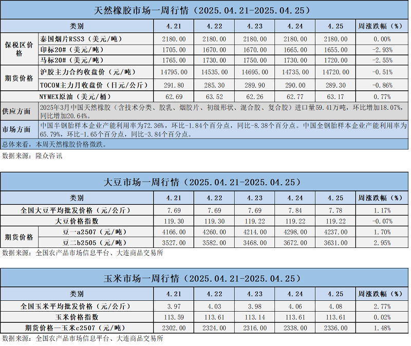天然橡膠、大豆、玉米市場(chǎng)一周行情(2025.04.21-04.25)