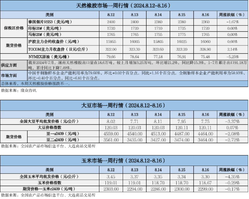 天然橡膠、大豆、玉米市場一周行情(2024.08.12-08.16)