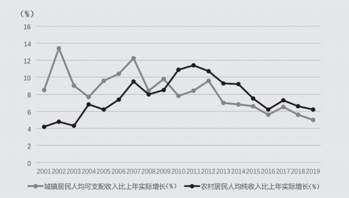 圖2 2001年~2019年我國城鄉(xiāng)居民收入增速對比