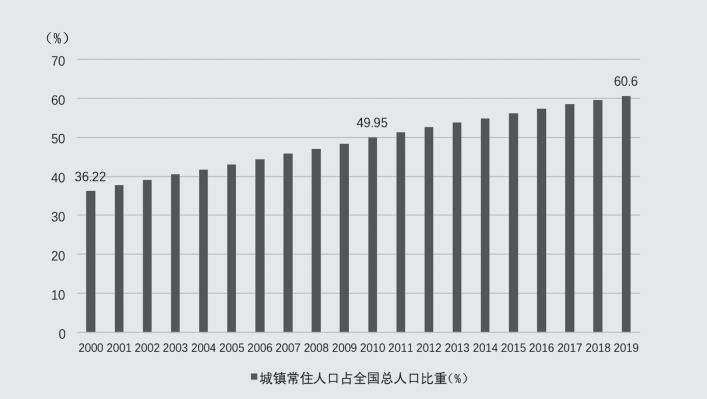 圖3 2000年~2019年我國城鎮(zhèn)常住人口占全國總?cè)丝诘谋戎?