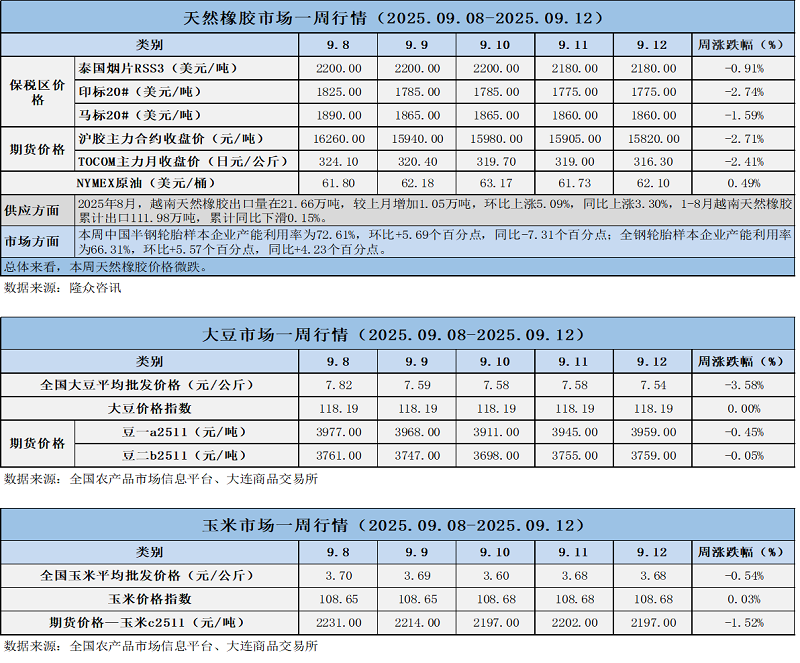 天然橡膠、大豆、玉米市場一周行情(2025.09.08-09.12)