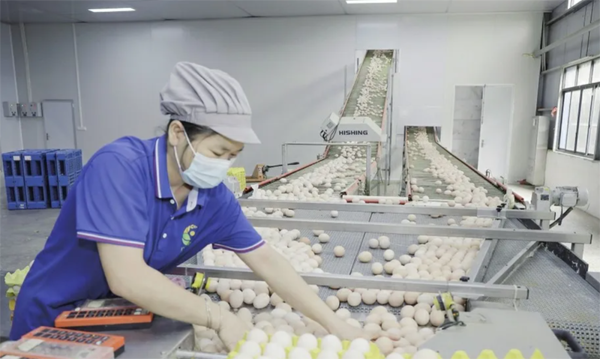 在雞蛋分揀車間,每一枚雞蛋都要經(jīng)過由丹麥進(jìn)口的賽諾沃生產(chǎn)線共12道工序才能達(dá)到出產(chǎn)的標(biāo)準(zhǔn)。次蛋光學(xué)篩選、食品級清洗、紫外線殺菌、裂紋聲波檢測、可食用白油覆膜、激光噴碼、全自裝箱……雞蛋自動(dòng)化生產(chǎn)流程一氣呵成?!叭ツ辍畯V墾鳳鮮’雞蛋通過NSF無抗生素認(rèn)證時(shí),審核員都不敢相信中國農(nóng)場能達(dá)到歐盟標(biāo)準(zhǔn)?!绷何暮曜院赖卣故局u蛋溯源系統(tǒng),掃碼可見每枚蛋產(chǎn)自哪棟雞舍、哪批飼料。