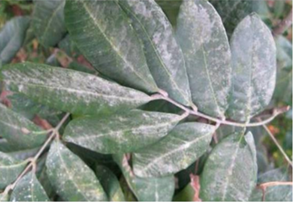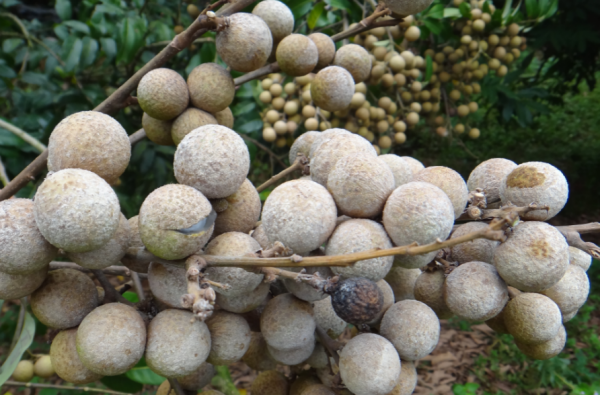 白霉病主要為害接近成熟的龍眼果實及葉片,嚴重時在病果和病葉表面覆蓋一層白色霉狀物,導致部分果枝干枯、葉片早衰、果實脫落或果皮暗褐色、果肉變質腐爛;中度和輕度發(fā)病的果實,雖果肉未腐爛,但品質與風味下降(圖1)。受果園地面高濕度和樹冠枝葉密集影響,該病往往先發(fā)生在樹冠中下層枝葉稠密的果穗或葉片上。因此,建議各龍眼產(chǎn)區(qū)主管生產(chǎn)的技術人員或果園主加強踏查,監(jiān)測病情發(fā)展,發(fā)病果穗超過5%的龍眼果園應進行噴藥防治。果實發(fā)育距采摘10天以上,可噴灑25%咪鮮胺(施???乳油1500倍液,或45%咪鮮胺(施???水乳劑2000-2500倍液,或43%氟菌•肟菌酯(露娜森)懸浮劑,或60%唑酯•代森聯(lián)(百泰)水分散粒劑 1000-1500 倍,或560克/升嘧菌•百菌清(阿米多彩)懸浮劑1000倍1-2次,間隔7-10天;若發(fā)病龍眼園的果實接近采收,即距離采摘收獲不足10天,可噴灑25%咪鮮胺(施???乳油1500倍液或45%咪鮮胺(施保克)水乳劑2000-2500倍液1次,確保龍眼果品安全。