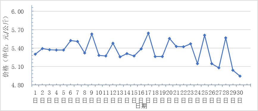 4月,全國(guó)重點(diǎn)監(jiān)測(cè)農(nóng)產(chǎn)品批發(fā)市場(chǎng)香蕉總交易量達(dá)3.1萬(wàn)噸,同比增長(zhǎng)14.8%,環(huán)比增長(zhǎng)14.8%;總交易價(jià)值16535萬(wàn)元,同比下降14.2%,環(huán)比增長(zhǎng)15.6%。日平均價(jià)格最高為5.7元/千克,最低為5.0元/千克,全月平均價(jià)格為5.4元/千克,同比下降15.6%,環(huán)比增長(zhǎng)1.9%(每日價(jià)格變化如圖)。