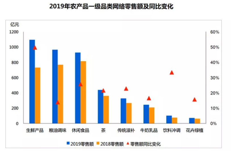 《報(bào)告》數(shù)據(jù)顯示,2019年全國(guó)農(nóng)產(chǎn)品網(wǎng)絡(luò)零售額達(dá)4168.6億元,其中生鮮產(chǎn)品消費(fèi)占比在飛速上升。同期生鮮產(chǎn)品網(wǎng)絡(luò)零售額超過(guò)1094.9億元,網(wǎng)絡(luò)零售量同比增加78.4%,成為規(guī)模最大、增速最快的類目。