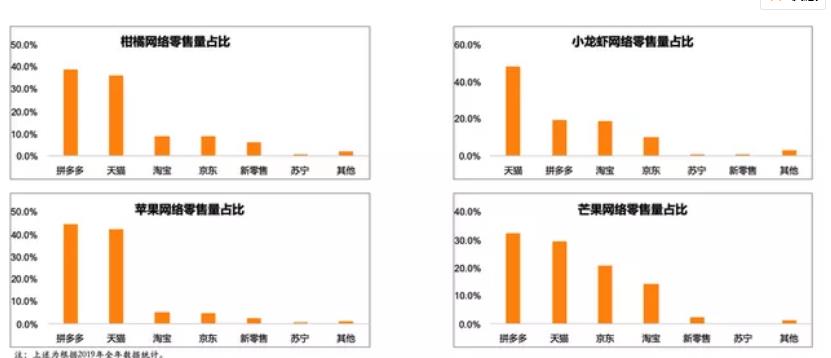 同時(shí),在蘋果、柑橘、芒果品類的網(wǎng)絡(luò)零售量分布中,來(lái)自拼多多等新電商平臺(tái)的渠道占比分別達(dá)44.35%、38.6%、32.2%,均排名第一。在“網(wǎng)紅單品”小龍蝦品類中,傳統(tǒng)電商平臺(tái)仍占絕對(duì)優(yōu)勢(shì),但新電商平臺(tái)消費(fèi)增長(zhǎng)迅速,渠道占比已躍居第二。