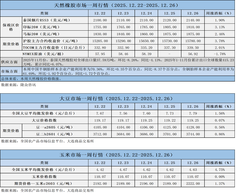天然橡膠、大豆、玉米市場(chǎng)一周行情(2025.12.22-12.26)