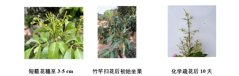 2026年中晚熟荔枝總體呈現(xiàn)中小年成花,但對(duì)于花穗超過15cm的果樹仍要進(jìn)行疏花,保證營養(yǎng)供給。疏花方法分為物理疏花和化學(xué)疏花。物理疏花,以仙進(jìn)奉荔枝為例,選用手持剪刀、電動(dòng)疏花機(jī)疏花,可短截花穗至3~5 cm;選用竹竿掃花,可掃掉4/5的花量。其他品種可參照?qǐng)?zhí)行。這種方法疏花量可控,風(fēng)險(xiǎn)低,但勞動(dòng)量大?;瘜W(xué)疏花,可選用 40%乙烯利5000倍液和15%多效唑800倍液混合噴施,或 6%乙氧氟草醚10000倍液和 15%多效唑800倍液混合噴施荔枝花穗。這種方法效率高,但技術(shù)門檻較高,要在當(dāng)?shù)剞r(nóng)技人員或技術(shù)專家的指導(dǎo)下,嚴(yán)格把握用藥濃度和藥量,建議使用前選擇少量樹體進(jìn)行試驗(yàn),確定無藥害后再大面積施用。若遇溫度高、光照強(qiáng)時(shí)要適當(dāng)降低濃度,噴濕即可,不可反復(fù)噴施。
