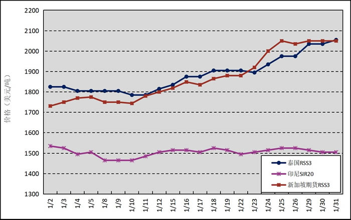 國外主產(chǎn)區(qū):1月,泰國RSS3平均價格為1885美元/噸,環(huán)比上漲158美元/噸,最高價為2055美元/噸,最低價為1785美元/噸;印尼SIR20平均價格為1505美元/噸,環(huán)比上漲71美元/噸,最高價為1535美元/噸,最低價為1465美元/噸;新加坡RSS3期貨主力合約月均結(jié)算價格為1870美元/噸,環(huán)比上漲182美元/噸,最高價為2050美元/噸,最低價為1731美元/噸。