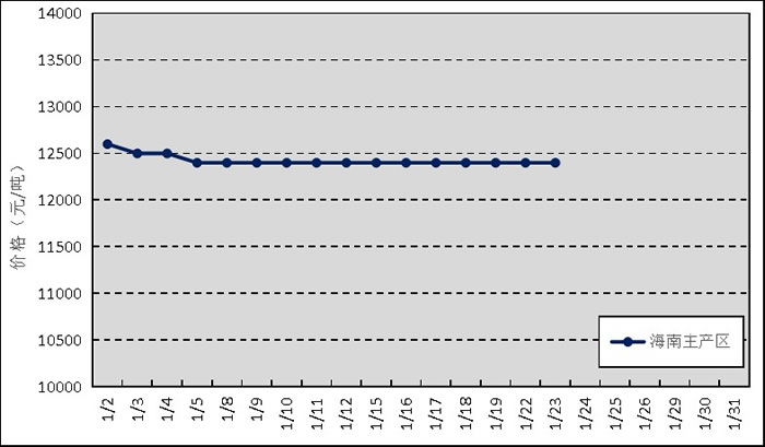 國內(nèi)主產(chǎn)區(qū):1月中下旬,海南產(chǎn)區(qū)全面停割,至此國內(nèi)膠園全部進入停割期。海南原料膠(折干膠)月均價格為12425元/噸,環(huán)比上漲158元/噸。