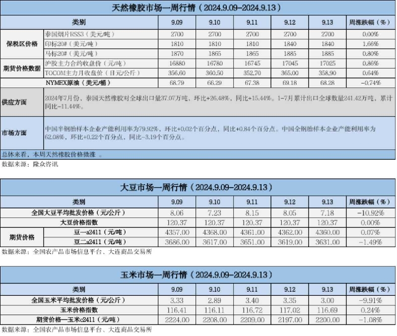 天然橡膠、大豆、玉米市場(chǎng)一周行情(2024.09.09-09.13)
