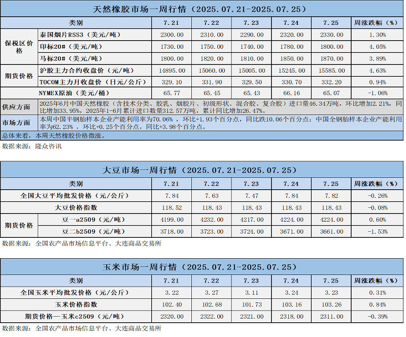 天然橡膠、大豆、玉米市場(chǎng)一周行情(2025.07.21-07.25)