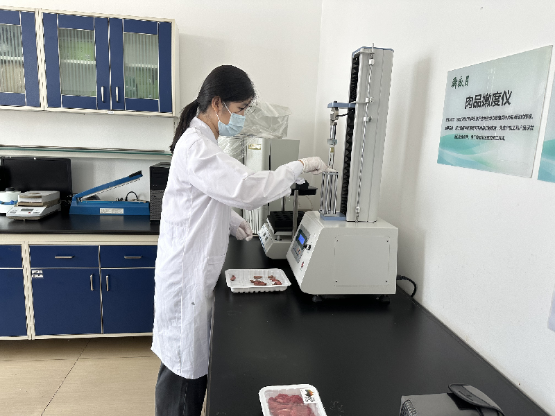 月盛齋公司為了守護舌尖上的安全與美味也做了不少工作。在肉品檢測中心,實驗員對新入廠的牛羊肉進行檢驗,將其提取物滴在檢測試紙上,對磺胺類、喹諾酮類等農獸藥殘留進行精準檢測,把好食材“入廠關”。工作人員還會對生產加工過程中的環(huán)境、物品進行取樣,并對其大腸桿菌、菌落總數(shù)、致病菌等微生物進行檢測,把好生產加工過程的“衛(wèi)生關”。在提升產品質量方面,他們用數(shù)據(jù)“說話”,通過指標測定直觀地為生產加工和產品研發(fā)提供參考。例如,“嫩度”是肉品食用品質中的重要指標之一,不僅決定牛肉質量,也是消費者和加工者最為重視的性質之一。在實驗室里,實驗員通過儀器剪切樣品時產生剪切力數(shù)值判斷肉品不同部位、不同烹飪方式的嫩度,便于確定更適宜的加工方式,以達到最佳口感。