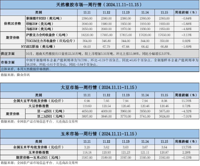 天然橡膠、大豆、玉米市場(chǎng)一周行情(2024.11.11-11.15)