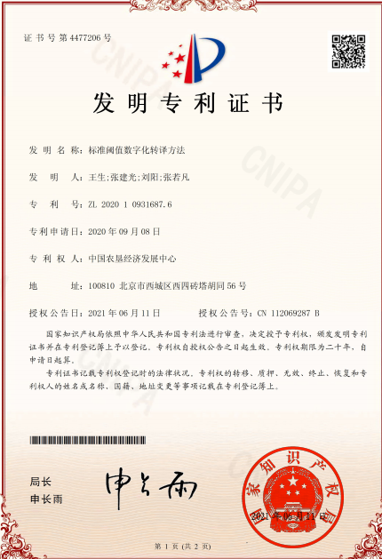 5. 2021年6月,信息服務(wù)處成功申請《標(biāo)準(zhǔn)閾值數(shù)字化轉(zhuǎn)譯方法》專利技術(shù),創(chuàng)造性地將產(chǎn)地環(huán)境標(biāo)準(zhǔn)、生產(chǎn)標(biāo)準(zhǔn)、產(chǎn)品標(biāo)準(zhǔn)等進(jìn)行數(shù)字化轉(zhuǎn)譯,將書面標(biāo)準(zhǔn)轉(zhuǎn)化為信息系統(tǒng)可識別的數(shù)字標(biāo)準(zhǔn),從而實(shí)現(xiàn)精準(zhǔn)質(zhì)量控制。目前已在多家農(nóng)墾企業(yè)的全面質(zhì)量管理數(shù)字化項(xiàng)目中應(yīng)用,涵蓋種植業(yè)、畜牧業(yè)、漁業(yè)等產(chǎn)業(yè),在推動(dòng)企業(yè)智能化質(zhì)量安全監(jiān)管、提升產(chǎn)品質(zhì)量等方面發(fā)揮了巨大作用。