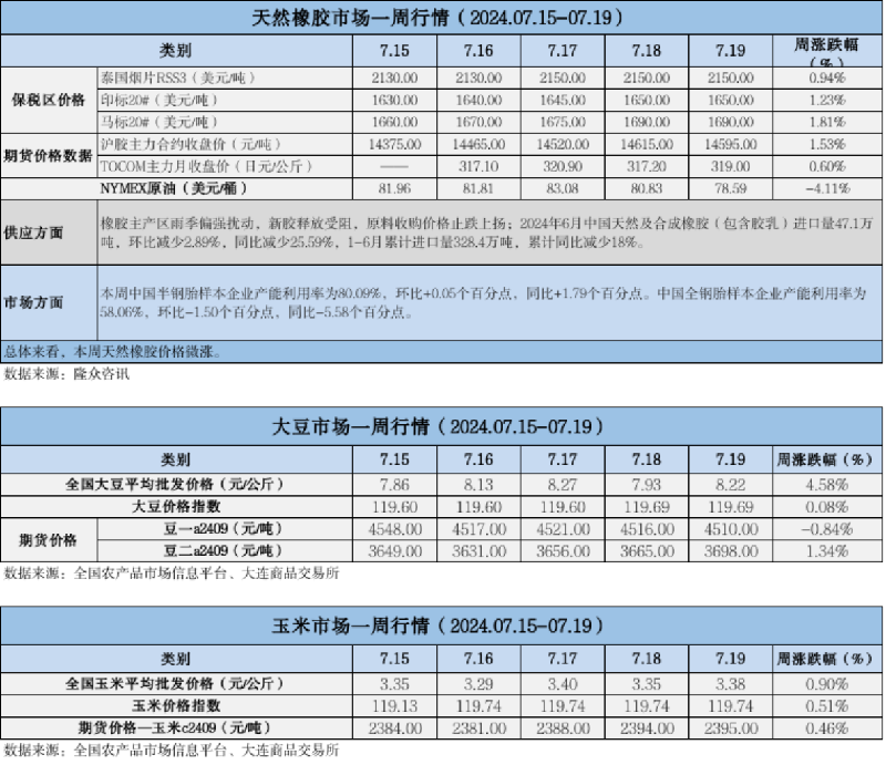 天然橡膠、大豆、玉米市場一周行情(2024.07.15-07.19)