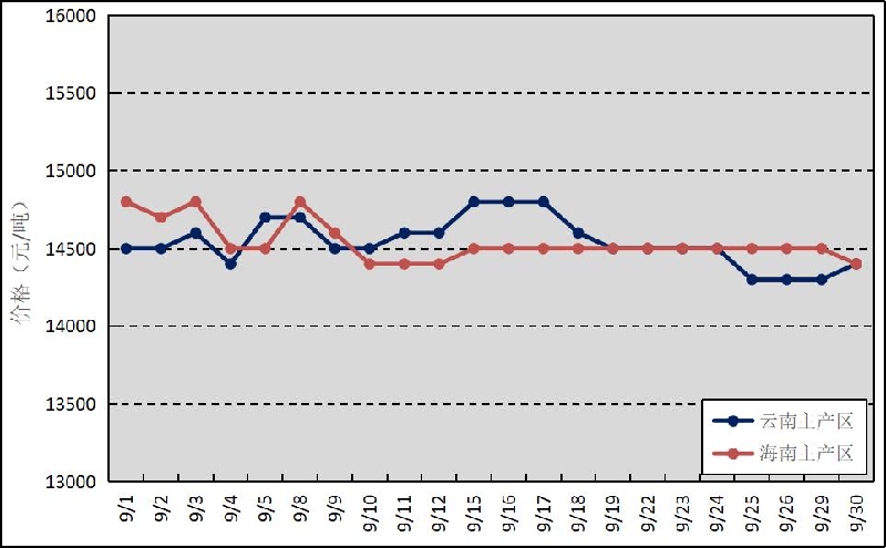 據(jù)農(nóng)業(yè)農(nóng)村部農(nóng)墾局監(jiān)測,9月,泰國3號(hào)煙膠片(RSS3)和印尼20號(hào)標(biāo)準(zhǔn)膠(SIR20)市場價(jià)格月內(nèi)呈穩(wěn)中微降走勢(shì),月均價(jià)格環(huán)比分別微跌和微漲。國內(nèi)主銷區(qū)國產(chǎn)全乳標(biāo)準(zhǔn)膠(SCRWF)現(xiàn)貨價(jià)格走勢(shì)與國外基本一致,全月整體在14250—15400元/噸之間波動(dòng),價(jià)格重心較上月上移。