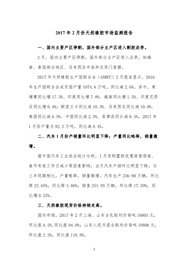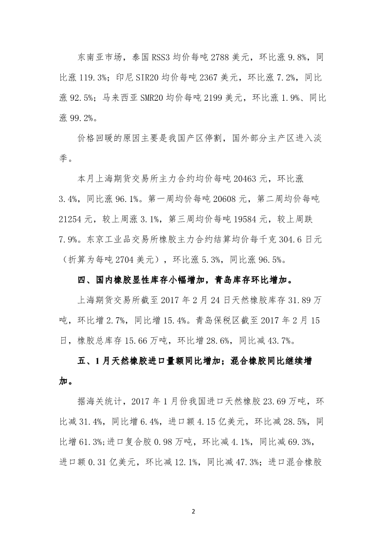 2017年2月份天然橡膠市場監(jiān)測報告
