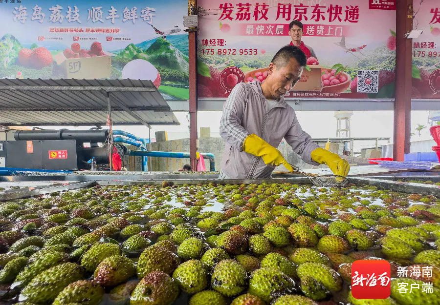 在??诮鹁G果水果產銷專業(yè)合作社服務站,村民陸續(xù)用三輪車將成熟荔枝運送過來,工人們清洗并精心挑選荔枝后,將其打包發(fā)往全國各地。