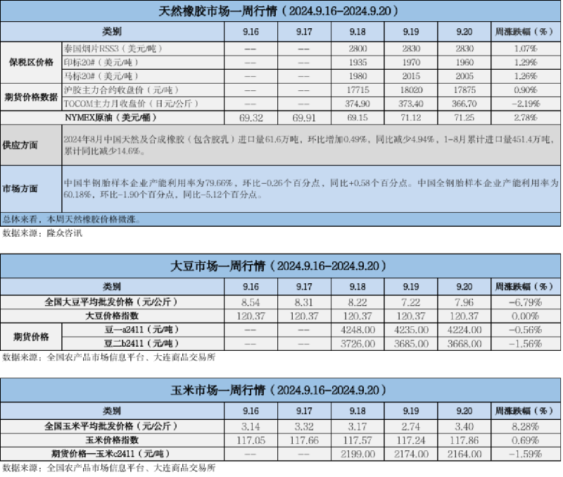 天然橡膠、大豆、玉米市場一周行情(2024.09.16-09.20)
