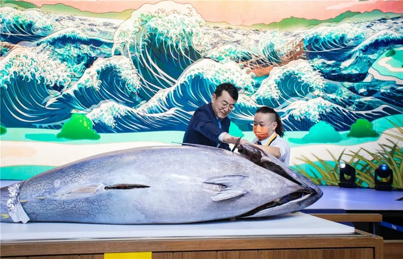 是明芳為“藍(lán)鰭金槍魚開魚秀”開啟第一刀。
