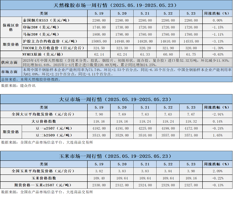 天然橡膠、大豆、玉米市場一周行情(2025.05.19-05.23)