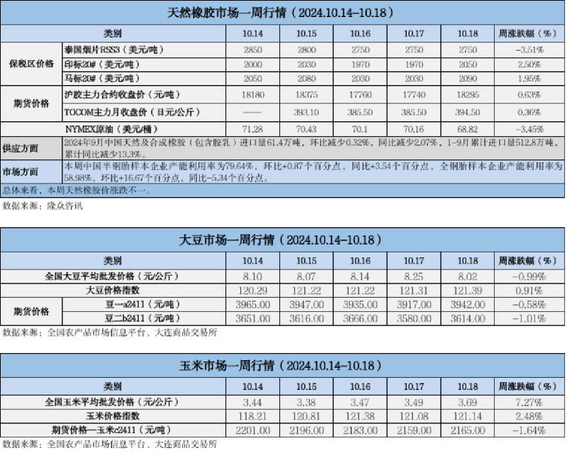 天然橡膠、大豆、玉米市場(chǎng)一周行情(2024.10.14-10.18)