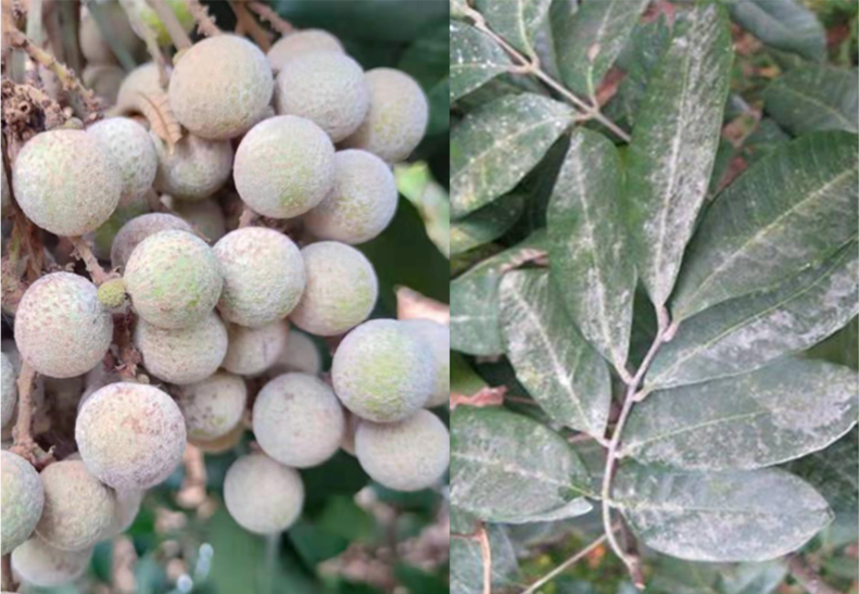 廣東與廣西是我國(guó)龍眼的重要主產(chǎn)區(qū),現(xiàn)正陸續(xù)進(jìn)入采收旺季。今年夏季持續(xù)高溫高濕,導(dǎo)致部分果園龍眼白霉病發(fā)生嚴(yán)重。該病主要為害接近成熟的龍眼果實(shí)及葉片,往往先發(fā)生在樹冠中下層枝葉稠密的果穗或葉片上。在果實(shí)上,病菌菌絲和孢子形成的一層白色霉?fàn)钗锟筛采w整個(gè)果實(shí)表面,導(dǎo)致部分果枝干枯和果實(shí)脫落或果皮暗褐色、果肉變質(zhì)腐爛;中度和輕度發(fā)病的果實(shí),雖果肉未腐爛,但品質(zhì)與風(fēng)味下降。受害葉片則正面覆蓋有一層白色霉?fàn)钗铮m不形成壞死病斑,但引致葉片早衰。