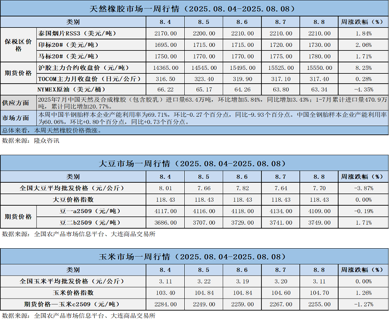 天然橡膠、大豆、玉米市場一周行情(2025.08.04-08.08)