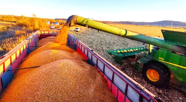 收割機(jī)放糧轉(zhuǎn)運(yùn)中。