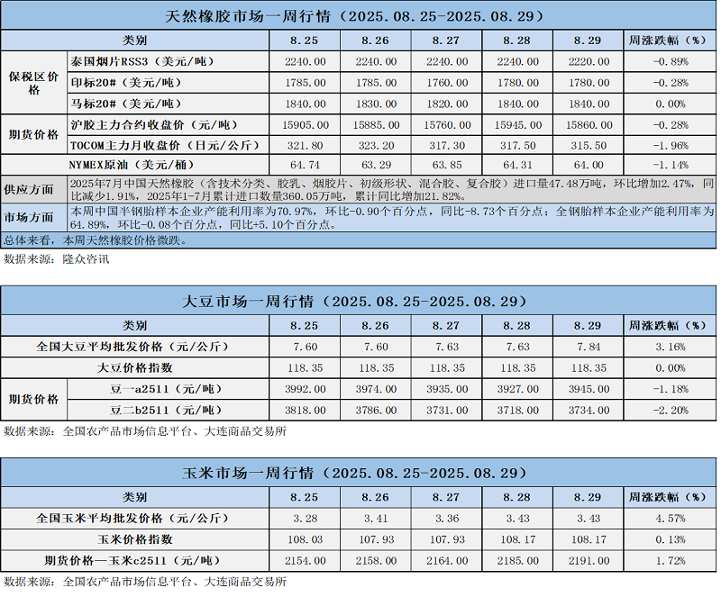 天然橡膠、大豆、玉米市場(chǎng)一周行情(2025.08.25-08.29)
