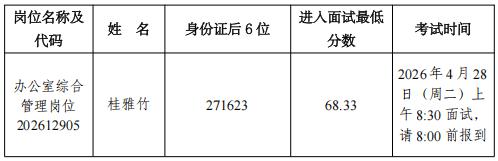 我單位2026年度公開招聘高校畢業(yè)生面試公告發(fā)布后,有1名考生因個(gè)人原因自愿放棄面試資格。經(jīng)研究,決定在報(bào)考同一崗位的考生中,按照筆試成績由高到低的順序進(jìn)行遞補(bǔ)。遞補(bǔ)考生名單如下:
