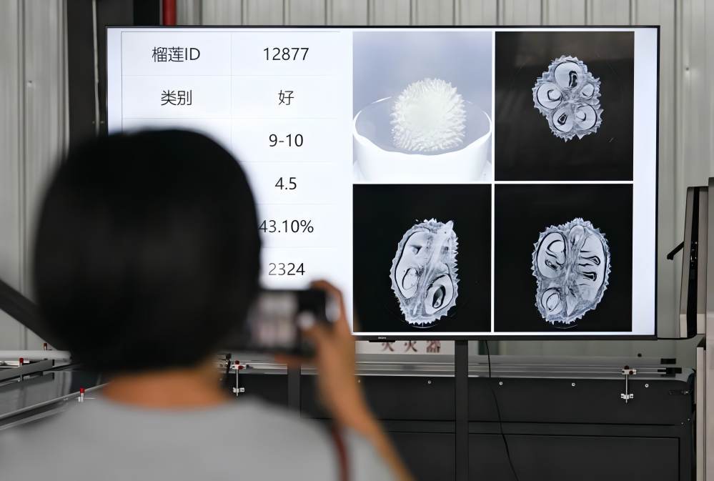 在海南三亞拍攝的由榴蓮智能分選生產(chǎn)線生成的榴蓮檢測數(shù)據(jù)及影像(7月18日攝)。新華社記者 蒲曉旭 攝