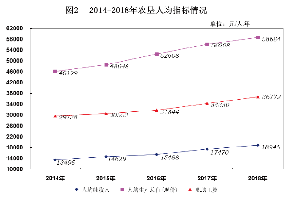 全年農(nóng)墾經(jīng)濟(jì)實(shí)現(xiàn)生產(chǎn)總值8157.20億元(見(jiàn)圖1)。其中,第一產(chǎn)業(yè)增加值1887.75億元;第二產(chǎn)業(yè)增加值3516.68億元;第三產(chǎn)業(yè)增加值2752.77億元。第一、第二、第三產(chǎn)業(yè)增加值占農(nóng)墾生產(chǎn)總值的比重分別為23.1%、43.1%和33.7%。人均生產(chǎn)總值58684元;人均純收入持續(xù)增長(zhǎng),達(dá)到18946元,比上年增長(zhǎng)8.4%(見(jiàn)圖2)。