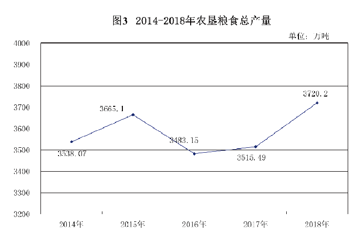 糧食總產(chǎn)量達(dá)到3720.20萬(wàn)噸,比上年增加204.71萬(wàn)噸,增長(zhǎng)5.8%(見(jiàn)圖3)。
