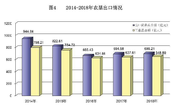 全年出口供貨商品總金額699.21億元(見(jiàn)圖4),比上年增加4.63億元,增長(zhǎng)0.7%。出口商品供貨總額超過(guò)10億元的墾區(qū)分別是:新疆兵團(tuán)473.07億元、廣東77.65億元、湖北40.96億元、江西37.07億元、河北24.27億元、廣西10.04億元,上述6個(gè)墾區(qū)出口金額合計(jì)達(dá)663.06億元,占全國(guó)農(nóng)墾出口商品總金額的94.8%。