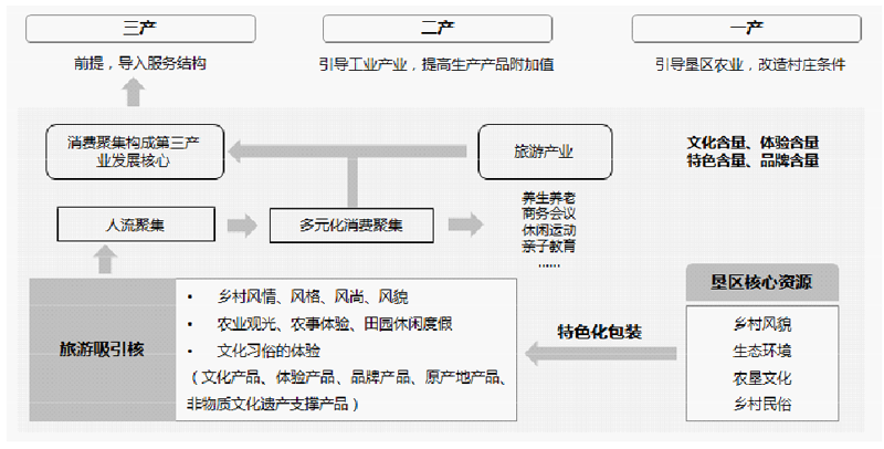 農(nóng)墾系統(tǒng)的“321”全產(chǎn)業(yè)鏈發(fā)展模式,強調(diào)三產(chǎn)之間的互動效率和產(chǎn)業(yè)能力提升。這一模式以墾區(qū)核心資源的分析挖掘為起點,通過對資源的特色化、產(chǎn)品化包裝形成旅游產(chǎn)業(yè)的吸引核,以聚集人氣,形成旅游引導(dǎo)的消費聚集,并引致消費產(chǎn)業(yè)的就業(yè)供給側(cè)聚集,形成以旅游產(chǎn)業(yè)為核心的三產(chǎn)服務(wù)結(jié)構(gòu),進而引導(dǎo)加工產(chǎn)業(yè)發(fā)展,帶動墾區(qū)農(nóng)業(yè)發(fā)展方式轉(zhuǎn)型升級。